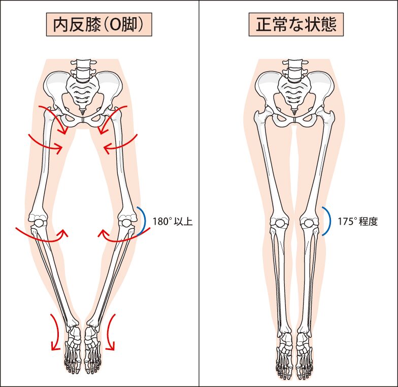 特に、内股やがに股で歩く癖があると、膝関節に偏った力が加わり、炎症や痛みを引き起こすことがあります。
